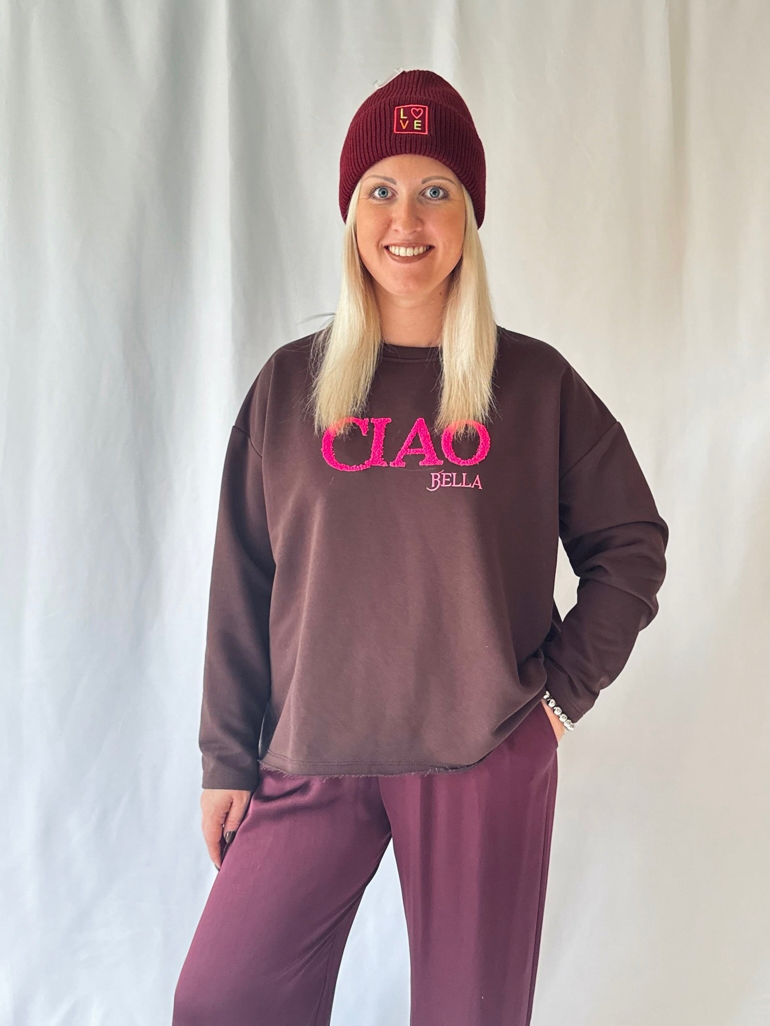 Casual, cool, komfortabel – unser Ciao Sweatshirt in Braun begleitet dich entspannt durch den Tag. Lockerer Schnitt und weiches Material machen es zum Wohlfühlteil für jede Gelegenheit. Mit dem pinken Statement Print passt es auch perfekt über dein Lieblingskleid und macht jedes Outfit zum Highlight.