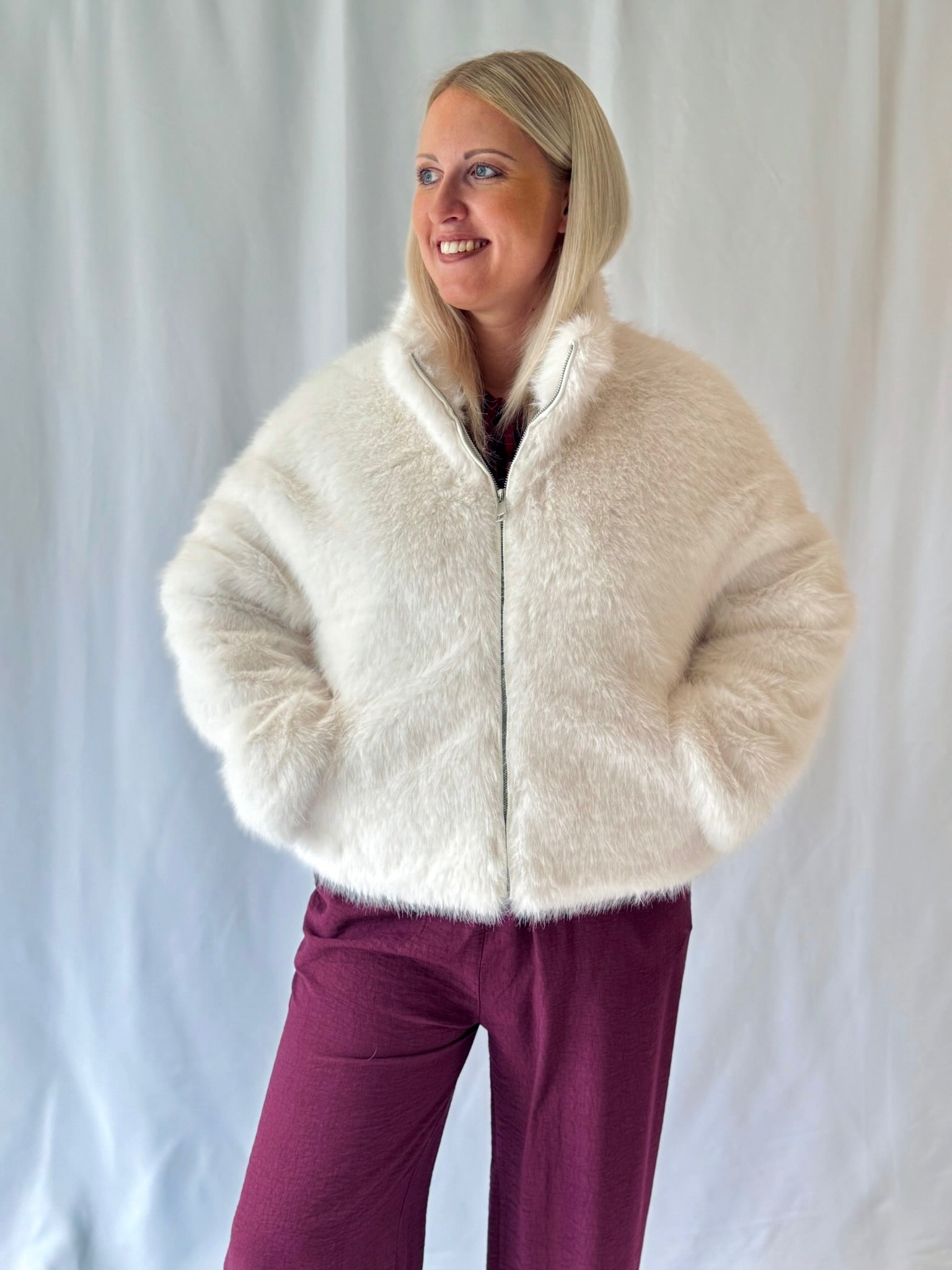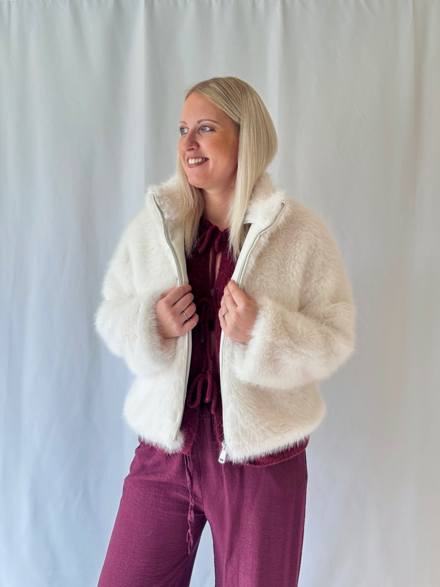 So flauschig wie stylisch – unsere Felljacke in Wollweiß ist das Statement-Piece für kalte Tage. Sie bringt Wärme, Eleganz und ein kleines bisschen Luxus in deinen Alltag.