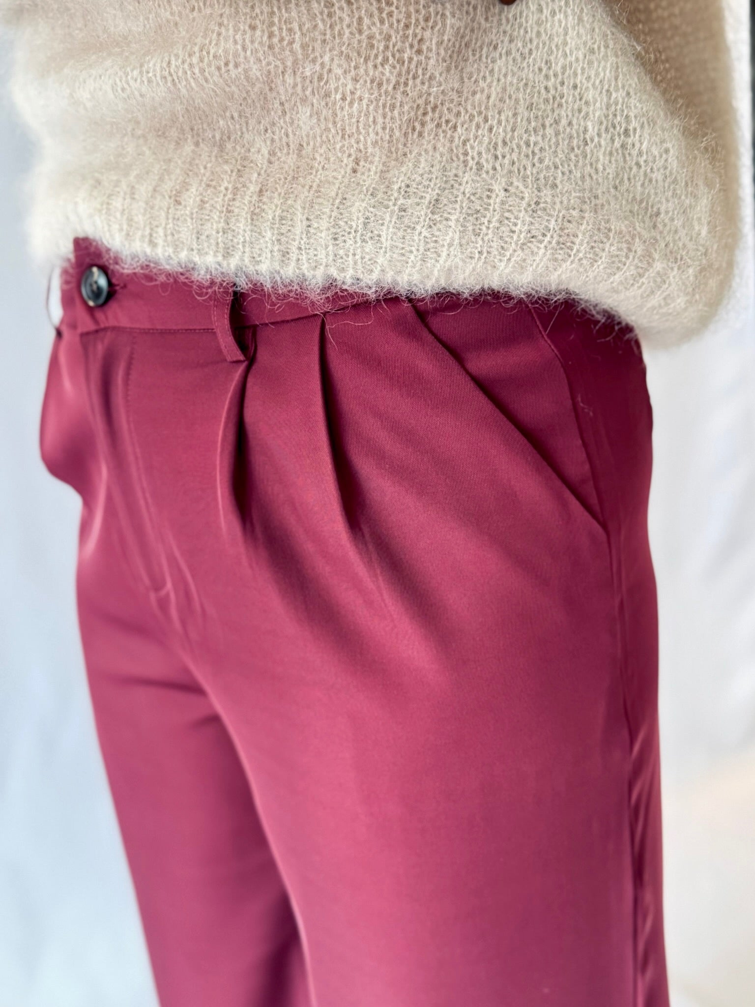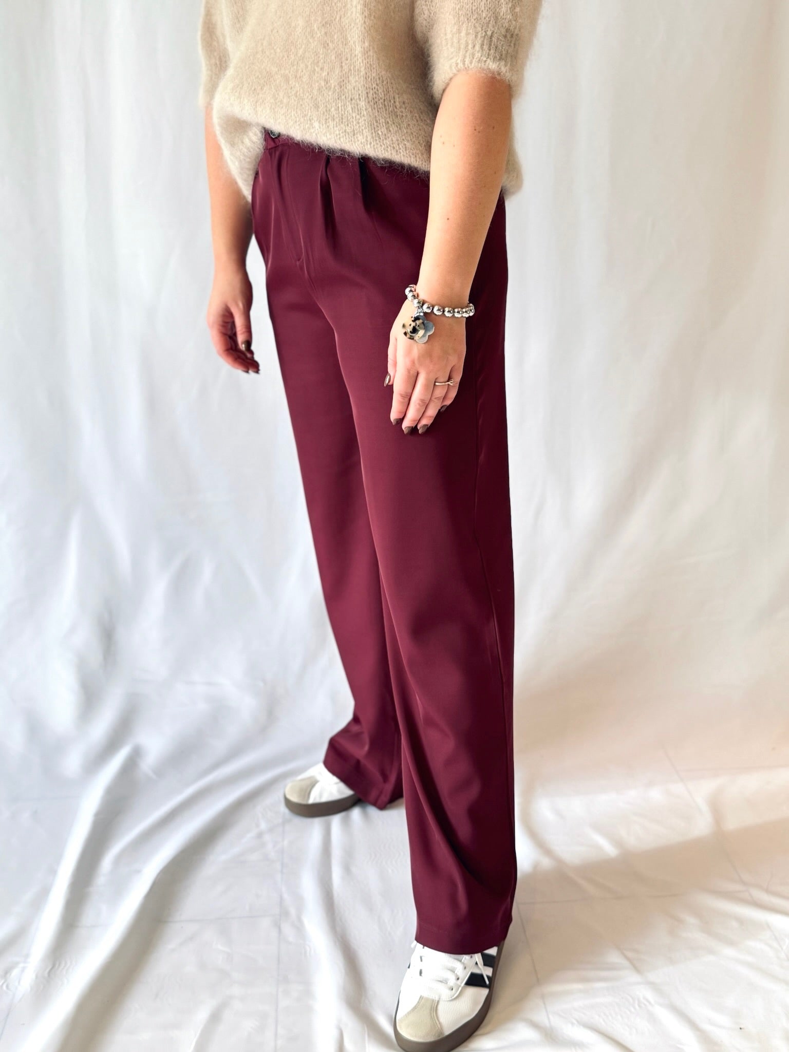 Feminin, elegant und doch lässig – die Anzughose in Bordeaux ist ein Statement für moderne Frauen. Perfekt für den Office-Look oder den City-Style mit Sneakern.