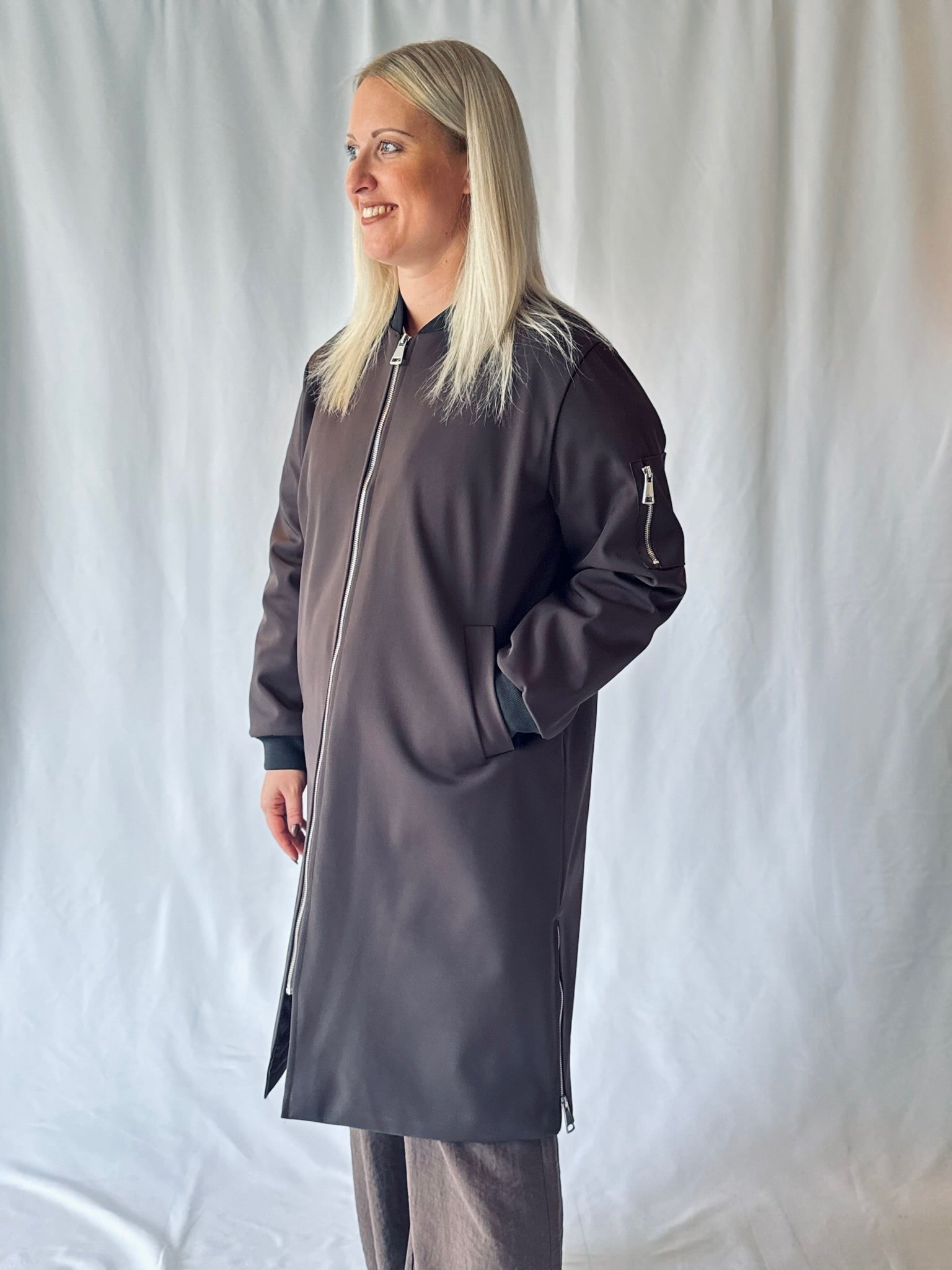 Der perfekte Mix aus sportlich und chic – unser brauner Bomber-Mantel hält dich warm und sieht dabei unglaublich cool aus. Ideal für den modernen Streetstyle.