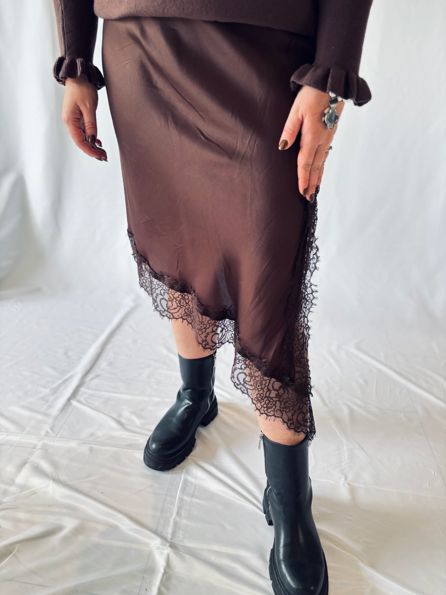 Zart, feminin und edel – der Spitzenrock in Braun ist ein echtes Highlight für festliche Tage. Mit Strick kombiniert wirkt er modern und cozy zugleich.