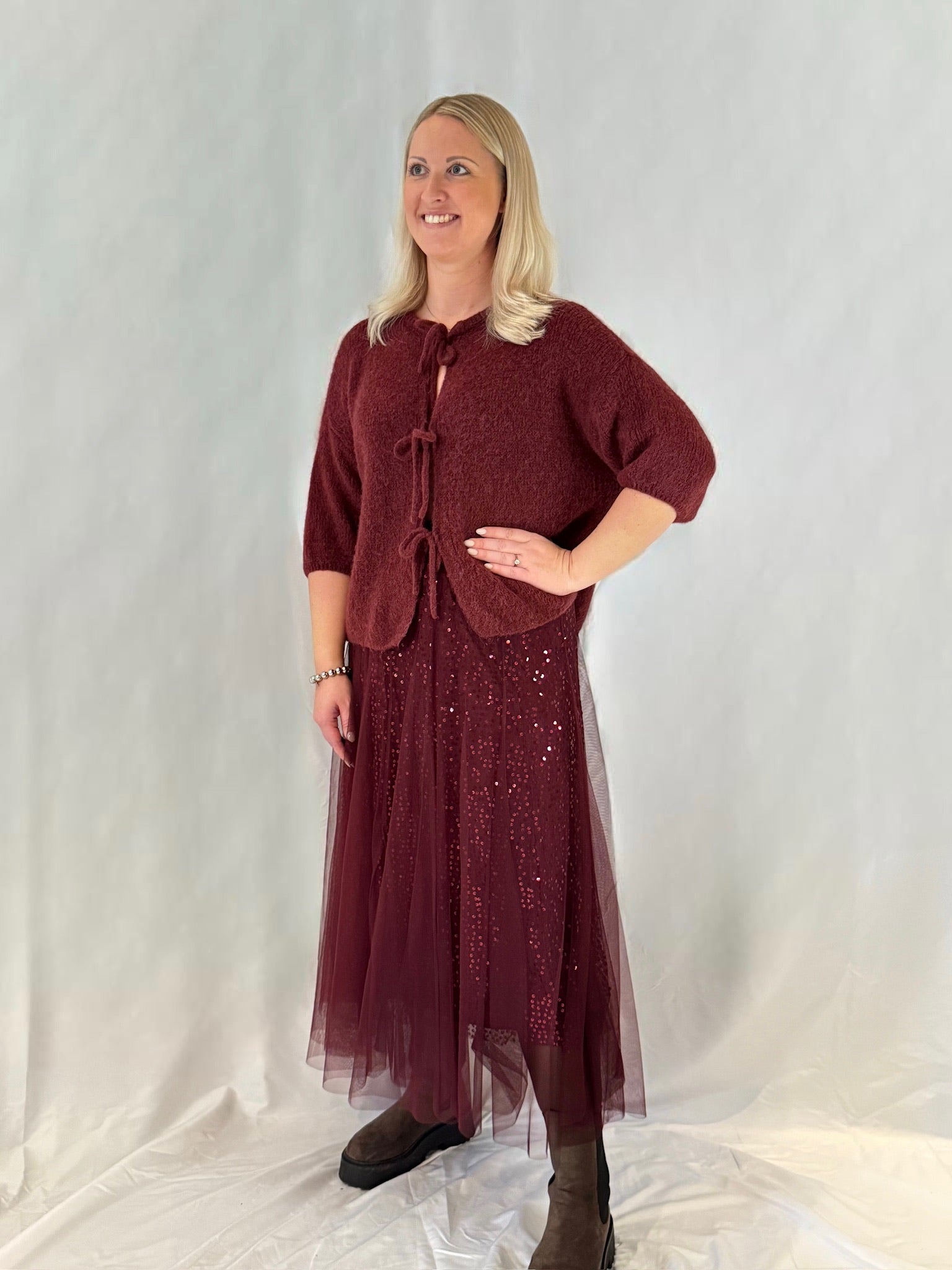 Bordeauxfarbener Tüll mit Glitzer – leicht, funkelnd und absolut festtagstauglich. Für Looks, die sofort wirken.